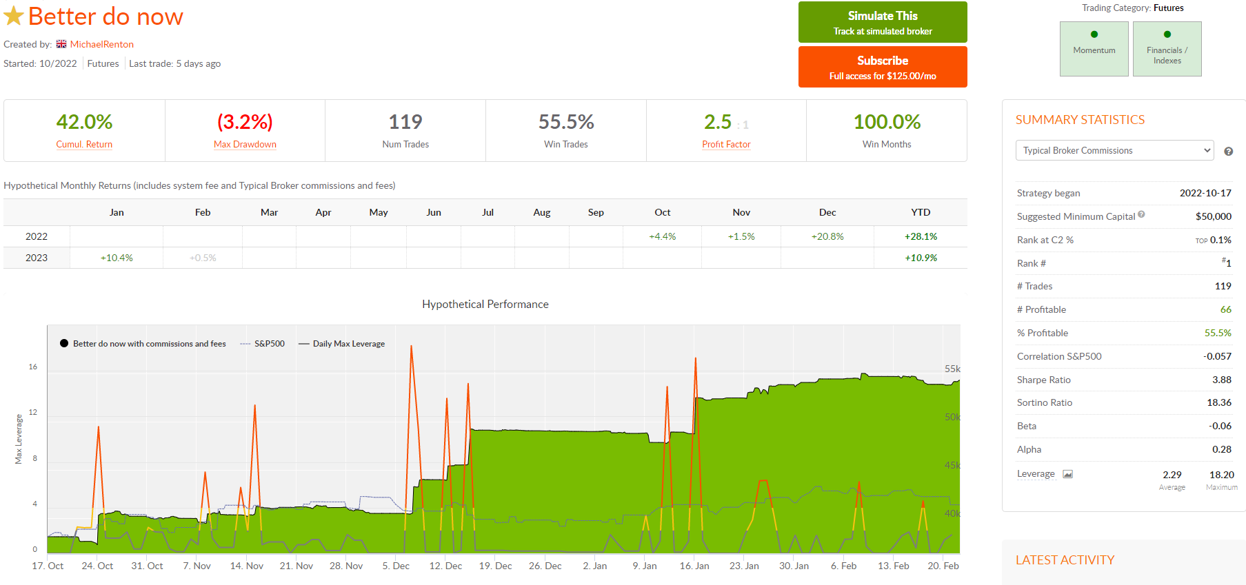 Just a few minutes ago I got an email about Collective2.com and its strategy of the week, Better Do Now which is run by user MichaelRenton. The strategy is currently followed by roughly 111 people (some paying subscribers, some not). There is also a total of $561,000 of real money following the strategy.
