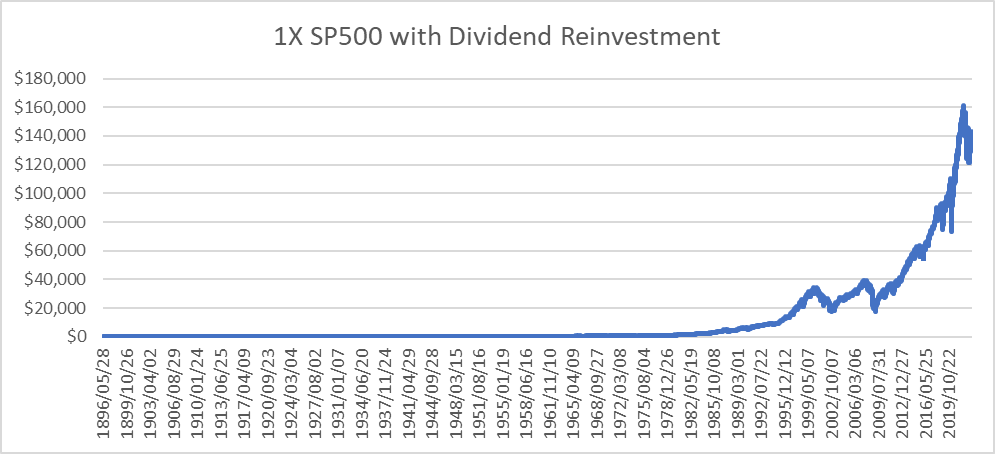When in doubt, zoom out. This compiles the data from SPX and SP500 dividend yield from two different sources to show the growth of a simple buy, hold, reinvest strategy.