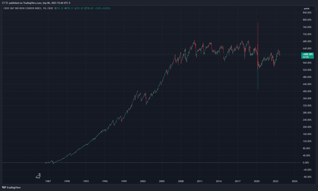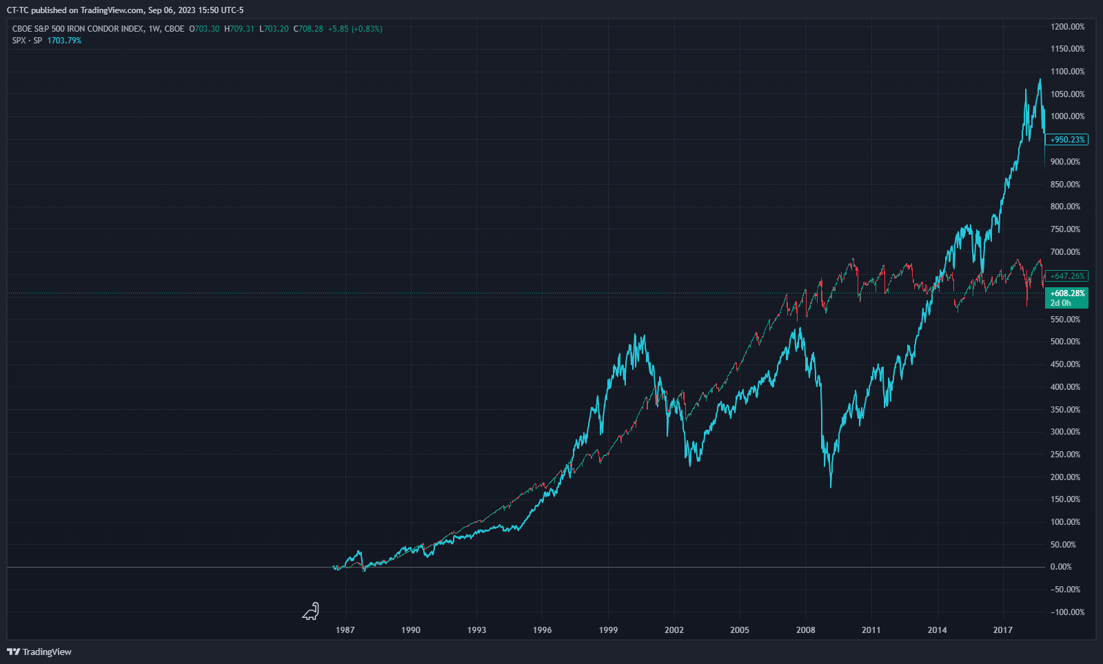 The difficulty in beating a market is that you must not only predict the future but you must predict it better than others. Until today I had never noticed the Iron Condor index CNDR. As shown below this index did quite well from the late 80s to about 2008. My guess is that this index of collecting option premiums did great in that time period because the option markets were not very efficient then and sellers had an advantage. Of course, overtime it is easy to lose an edge as more people discover it. I believe this is why this index has had a near zero return since 2008 and likely will have a long term near zero return going forward.