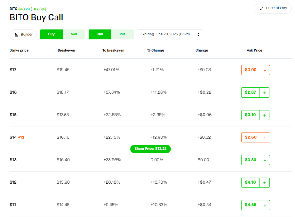 The main benefit of BITO is that it is marginable. So I can easily withdraw cash from my broker to fund IRAs, SEPs, HSAs, etc. Also BITO does have option chains. I have been looking at the 6/20/2025 expirations since they are far out and would benefit from lower tax rates if I held to expiration and the price moved in my favor. When looking at the option chains I did notice that some of the option ask prices didn’t make much sense. So I took the screenshot below.