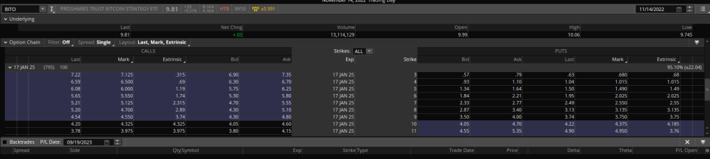 Something just isn’t making sense. I think I may have found part of the problem. If I look at the price of BITO on November 14th, 2022 the price was $9.81. However, this is the price without adjusting for dividends. If I look at the price adjusted for dividends the price on that date was $8.34. So holding BITO would have had a profit of $16,590 * (13.84 – 8.34)/8.34 = $10,940 which is right in line with Bitcoin. Most of the difference likely comes from time of end of day calculations etc. This is also where much of lost profit of the options is coming from, dividends. This is a good reminder that BITO held in a taxable account is not as good for a long term holder as Bitcoin if you expect gains. The money I recently moved to my SEP by selling BTC may now be converted to BITO to maintain exposure. The loss of dividends which have been substantial are where the hidden cost is. Once again the market is acting pretty efficiently and I feel like the dunce.