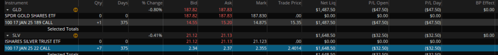 So today I decided to buy a little bit of gold and silver exposure via options. I didn’t want to tie up a lot of capital with this. So, I decided to use options. This allowed me to lay out about 1/10th the capital. The downside though is that if gold and silver don’t move up by about 10% then I am going to lose nearly all the money I put down. I need each of them to appreciate about 10% over the next year to break even. So, if this guy is right, which he isn’t, my little bet of about $1,600 on silver would become worth about $50,000! Too bad Bo Polny isn’t going to be right and the markets are not predictable based on time cycles or the Bible or prophecy. Instead of wasting a lot of money on the predictions he and Andy Schectman are making I will keep most of my money invested using my algorithms that have been doing great.